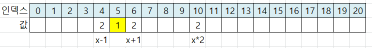 x*2 위치는 인덱스 4가 됩니다. 인덱스 4에 값 2를 저장합니다.