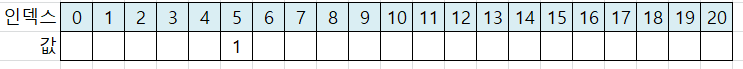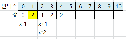 x+1 위치는 인덱스 3이 됩니다. 인덱스 3에 값 2를 저장합니다.