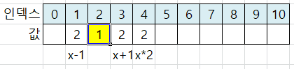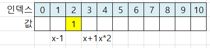 x-1 위치는 인덱스 1이 됩니다. 인덱스 1에 값 2를 저장합니다.