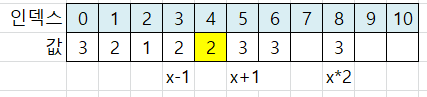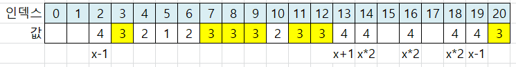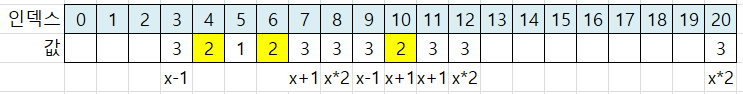 x*2 위치는 인덱스 8이 됩니다. 인덱스 8에 값 3을 저장합니다.