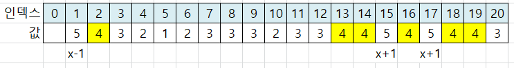 x+1 위치는 인덱스 4가 됩니다. 인덱스 4에 값 2가 존재합니다. 이미 가본 적이 있는 위치이므로 값 변경을 하지 않습니다.
