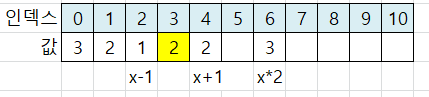 x*2 위치는 인덱스 6이 됩니다. 인덱스 6에 값 3을 저장합니다.