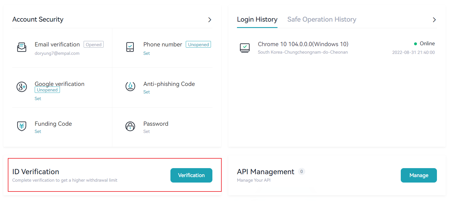 아래로 스크롤해보시면 맨 아래 좌측에 ID Verification이 있습니다.