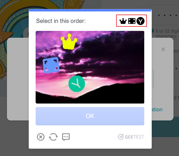 그러면 그 순서대로 아래 그림에서 왕관, 파란 네모, Y를 마우스로 하나씩 클릭하고 OK 버튼을 클릭하시면 됩니다.