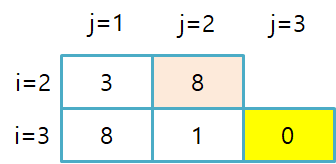 1번의 경우가 8로 더 크므로 D[3][3]에 8을 저장합니다.